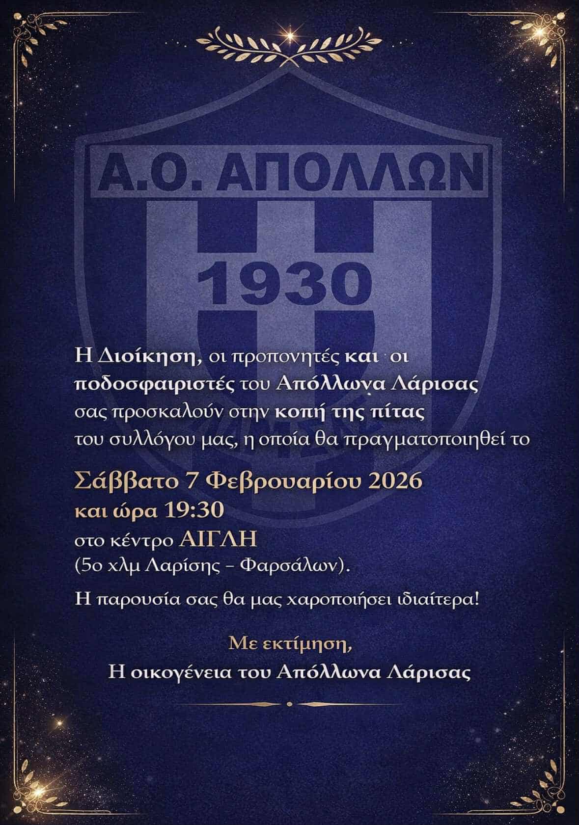 Η Διοίκηση, οι προπονητές και οι ποδοσφαιριστές του Απόλλωνα Λάρισας “σας προσκαλούν στην κοπή της πίτας του συλλόγου μας, η οποία θα πραγματοποιηθεί το Σάββατο 7 Φεβρουαρίου 2026 και ώρα 19:30 στο κέντρο ΑΙΓΛΗ (5ο χλμ Λάρισας – Φαρσάλων)”.