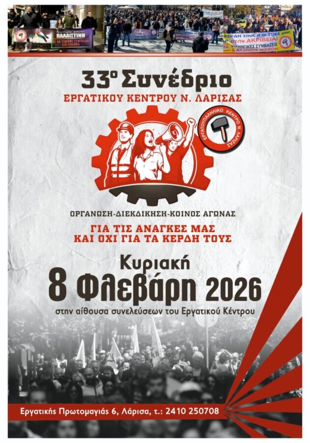 Αύριο Κυριακή, στις 9:30 π.μ. θα πραγματοποιηθεί το 33ο Εκλογοαπολογιστικό Συνέδριο των Αντιπροσώπων των Σωματείων του Εργατικού Κέντρου νομού Λάρισας. Οι εργασίες του Συνεδρίου θα γίνουν στην ισόγεια αίθουσα του ΕΚΝΛ «Τάκης Τσιόγκας» (Εργατικής Πρωτομαγιάς 6).