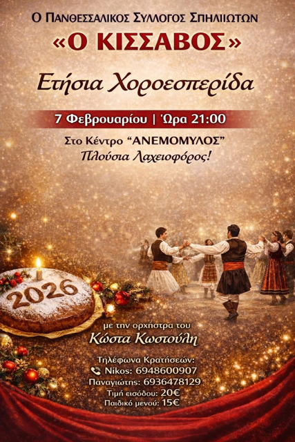 Ο Πανθεσσαλικός Σύλλογος Σπηλιωτών “Ο Κίσσαβος” “έχει τη χαρά να σας καλωσορίσει και να σας προσκαλέσει σήμερα στην ετήσια κοπή της πρωτοχρονιάτικης πίτας, μια βραδιά αφιερωμένη στη συνάντηση, τη συνέχιση της παράδοσης και την ενίσχυση των δεσμών της κοινότητάς μας.
