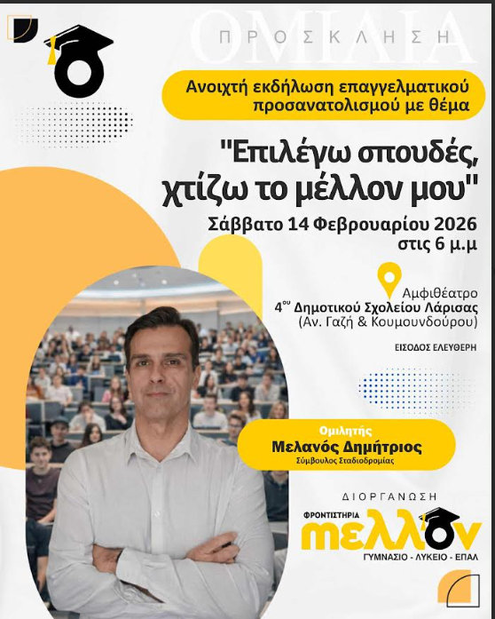 Ανοιχτή εκδήλωση επαγγελματικού προσανατολισμού με θέμα “Επιλέγω σπουδές, χτίζω το μέλλον μου” διοργανώνεται από τα φροντιστήρια mελλον, το Σάββατο 14 Φεβρουαρίου 2026 στις 6 μ.μ. στο αμφιθέατρο του 4ου Δημοτικού Σχολείου Λάρισας (Αν. Γαζή & Κουμουνδούρου).