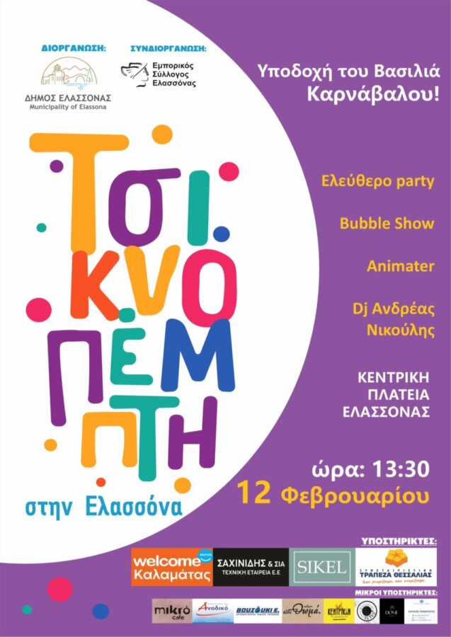 Σε συνεργασία με τον Εμπορικό Σύλλογο Ελασσόνας, την Καρναβαλική Ομάδα, τους τοπικούς πολιτιστικούς συλλόγους, κοινωνικούς φορείς και εθελοντές, ο Δήμος Ελασσόνας προσκαλεί μικρούς και μεγάλους να συμμετάσχουν σε ένα πλούσιο και πολυήμερο πρόγραμμα εκδηλώσεων, που παντρεύει την παράδοση με τη μουσική, τον χορό και το αυθεντικό καρναβαλικό κέφι.
