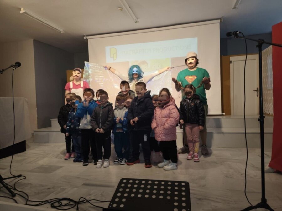 Ηθοποιοί και μικροί θεατές γέμισαν τη σκηνή με χαρά, γέλιο και τραγούδι, δημιουργώντας μια ζεστή και γιορτινή ατμόσφαιρα.