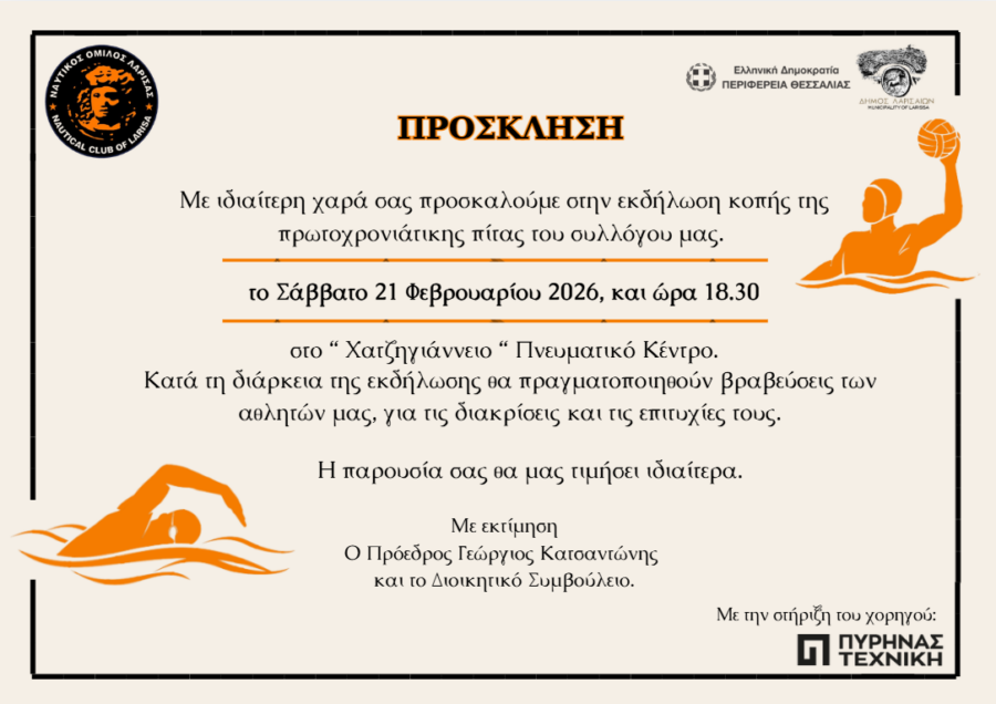 Με ιδιαίτερη χαρά σας προσκαλούμε στην εκδήλωση κοπής της πρωτοχρονιάτικης πίτας του συλλόγου μας, το Σάββατο 21 Φεβρουαρίου 2026, και ώρα 18.30 στο “Χατζηγιάννειο“ Πνευματικό Κέντρο.
