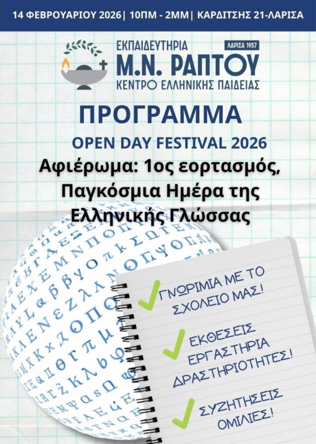 Το Σάββατο 14 Φεβρουαρίου 2026, από τις 10:00 έως τις 14:00, τα Εκπαιδευτήρια Μ. Ν. Ράπτου ανοίγουν τις πόρτες τους στο κοινό και παρουσιάζουν το πλήρες πρόγραμμα του Open Day Festival 2026, ενός πολυθεματικού φεστιβάλ αφιερωμένου στον πρώτο εορτασμό της Παγκόσμιας Ημέρας της Ελληνικής Γλώσσας.