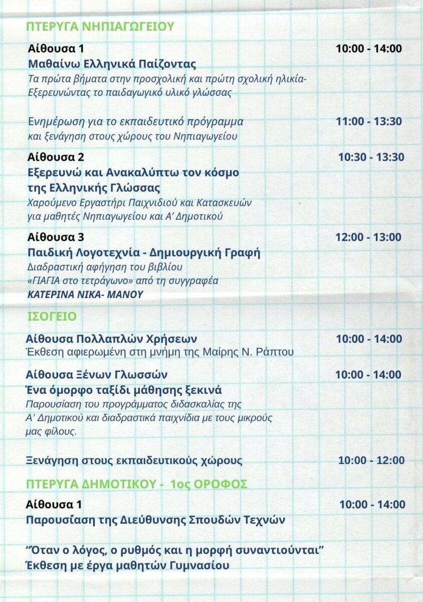 Η διοργάνωση περιλαμβάνει ένα ευρύ φάσμα εκπαιδευτικών, πολιτιστικών και βιωματικών δράσεων για παιδιά, γονείς και επισκέπτες, αναδεικνύοντας τη σημασία της ελληνικής γλώσσας ως ζωντανού πυρήνα της εκπαίδευσης, της σκέψης και του πολιτισμού.