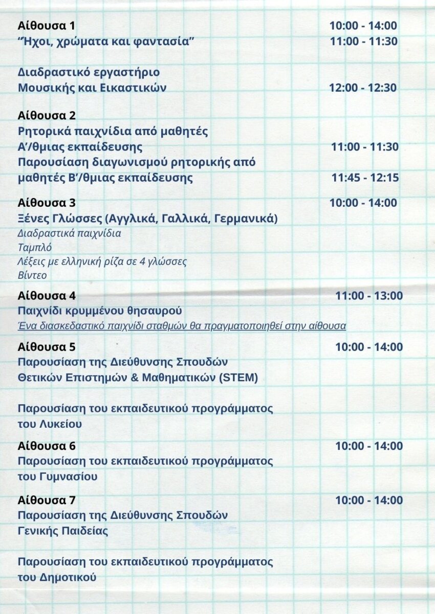 Οι επισκέπτες θα έχουν την ευκαιρία να συμμετάσχουν σε διαδραστικά εργαστήρια γλώσσας και δημιουργικής έκφρασης για μαθητές προσχολικής και σχολικής ηλικίας, σε παρουσιάσεις εκπαιδευτικών προγραμμάτων όλων των βαθμίδων (Νηπιαγωγείο, Δημοτικό, Γυμνάσιο, Λύκειο), καθώς και σε δράσεις που συνδέουν τη γλώσσα με τις τέχνες, τις ξένες γλώσσες, τη ρητορική, τις θετικές επιστήμες και τη σύγχρονη παιδαγωγική.