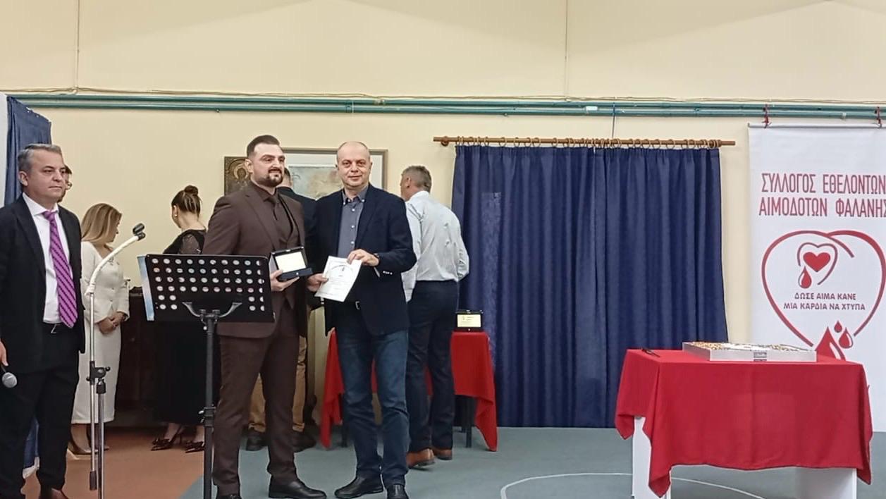 Τέλος, συμμετείχε στην απονομή επαίνων του Συλλόγου των Εθελοντών Αιμοδοτών της Φαλάνης, με την Πρόεδρο την κ. Ειρήνη Μάνη, συγχαίροντας τους εθελοντές για το πολύτιμο έργο τους, που σώζει ζωές και καλλιεργεί κουλτούρα ανιδιοτελούς προσφοράς.