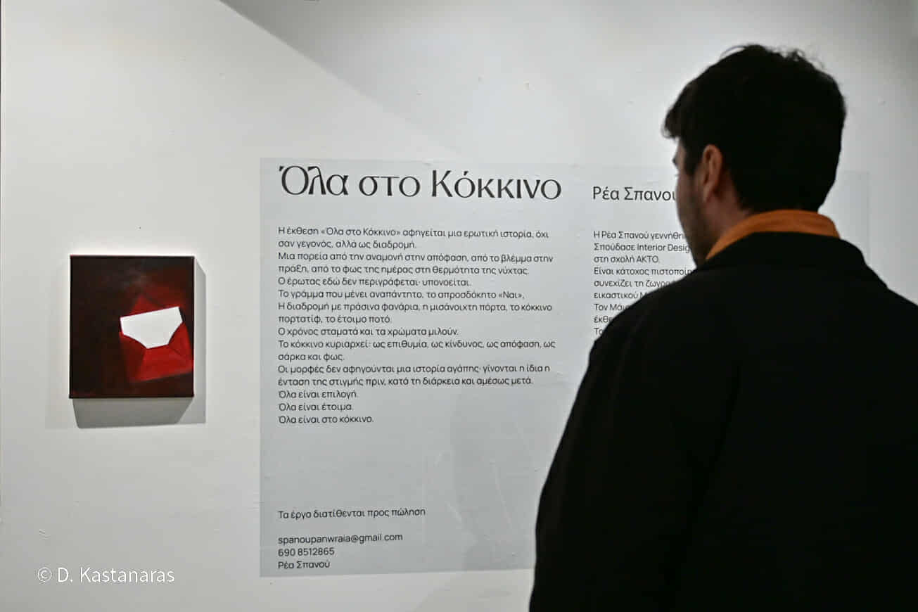 Η έκθεση «Όλα στο Κόκκινο» αφηγείται μια ερωτική ιστορία όχι ως γεγονός, αλλά ως διαδρομή. Μια πορεία από την αναμονή στην απόφαση, από το βλέμμα στην πράξη και από το φως της ημέρας στη θερμότητα της νύχτας.