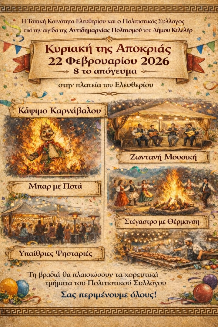 Τσικνίσματα, εδέσματα, παραδοσιακή φασολάδα, φακές και ντόπιο κρασί θα προσφερθούν στους επισκέπτες. Μουσική και ψυχαγωγητές θα εκτοξεύσουν την αποκριάτικη διάθεση. Οι Απόκριες φέτος έχουν προορισμό τον Δήμο Κιλελέρ όπου το κέφι ανάβει και η γιορτή ξεκινά. Μικροί και μεγάλοι ετοιμάζονται για μοναδικές αποκριάτικες εκδηλώσεις σε κάθε κοινότητα του Δήμου, με μουσική, χορό, παραδοσιακά δρώμενα και ατελείωτη διασκέδαση!