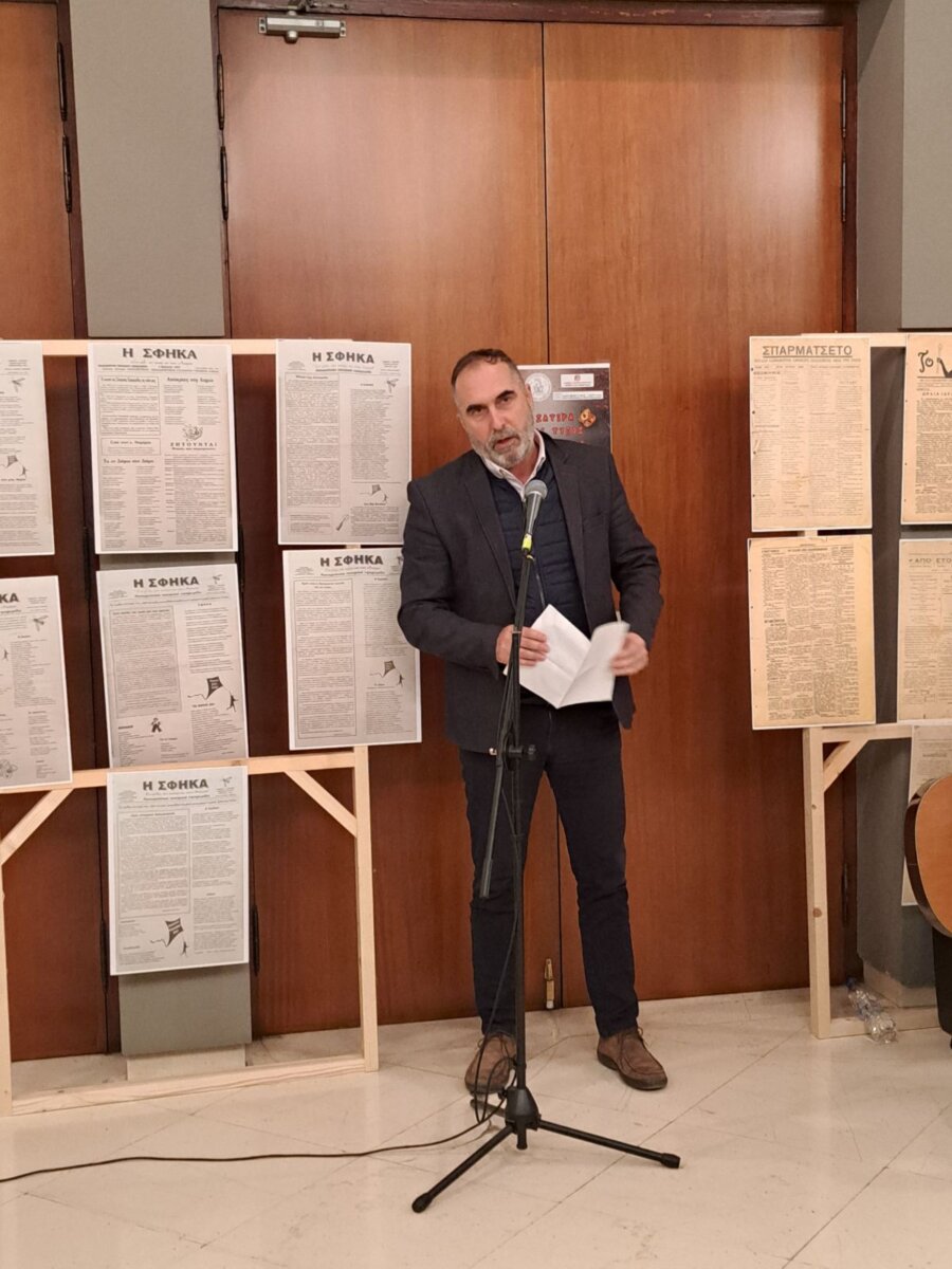 Η κ. Σοφία Βακιρτζηδέλη, Προϊσταμένη των Γενικών Αρχείων Κράτους – Τμήμα ΓΑΚ Φθιώτιδας, παρουσίασε τα σατιρικά έντυπα «Σπαρματσέτο» και «Αριστοφάνης» και επιμελήθηκε την έκθεση του αρχειακού υλικού.