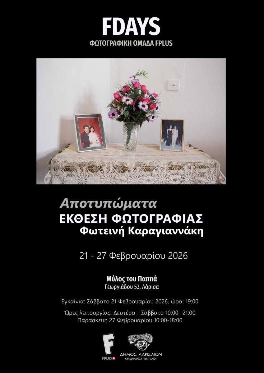 Η Φωτογραφική Ομάδα fplus σε συνεργασία με την Αντιδημαρχία Πολιτισμού του Δήμου Λαρισαίων, παρουσιάζουν στο πλαίσιο της δράσης FDAYS, την έκθεση φωτογραφίας της Φωτεινής Καραγιαννάκη με τίτλο «Αποτυπώματα».