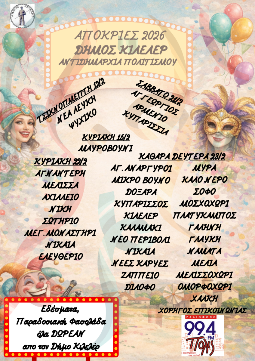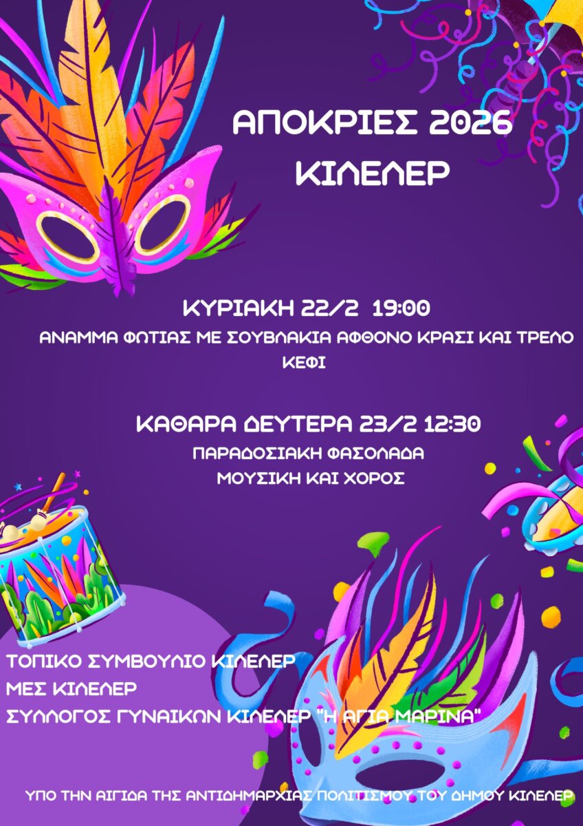 Σε αποκριάτικους ρυθμούς κινείται αυτές τις μέρες ο Δήμος Κιλελέρ. εκδηλώσεις ετοιμάζονται για το τετραήμερο 20,21,22 και 23 Φεβρουαρίου. Τσικνίσματα, εδέσματα, παραδοσιακή φασολάδα, φακές και ντόπιο κρασί θα προσφερθούν στους επισκέπτες. Μουσική και ψυχαγωγητές θα εκτοξεύσουν την αποκριάτικη διάθεση. Οι Απόκριες φέτος έχουν προορισμό τον Δήμο Κιλελέρ όπου το κέφι ανάβει και η γιορτή ξεκινά. Μικροί και μεγάλοι ετοιμάζονται για μοναδικές αποκριάτικες εκδηλώσεις σε κάθε κοινότητα του Δήμου, με μουσική, χορό, παραδοσιακά δρώμενα και ατελείωτη διασκέδαση!