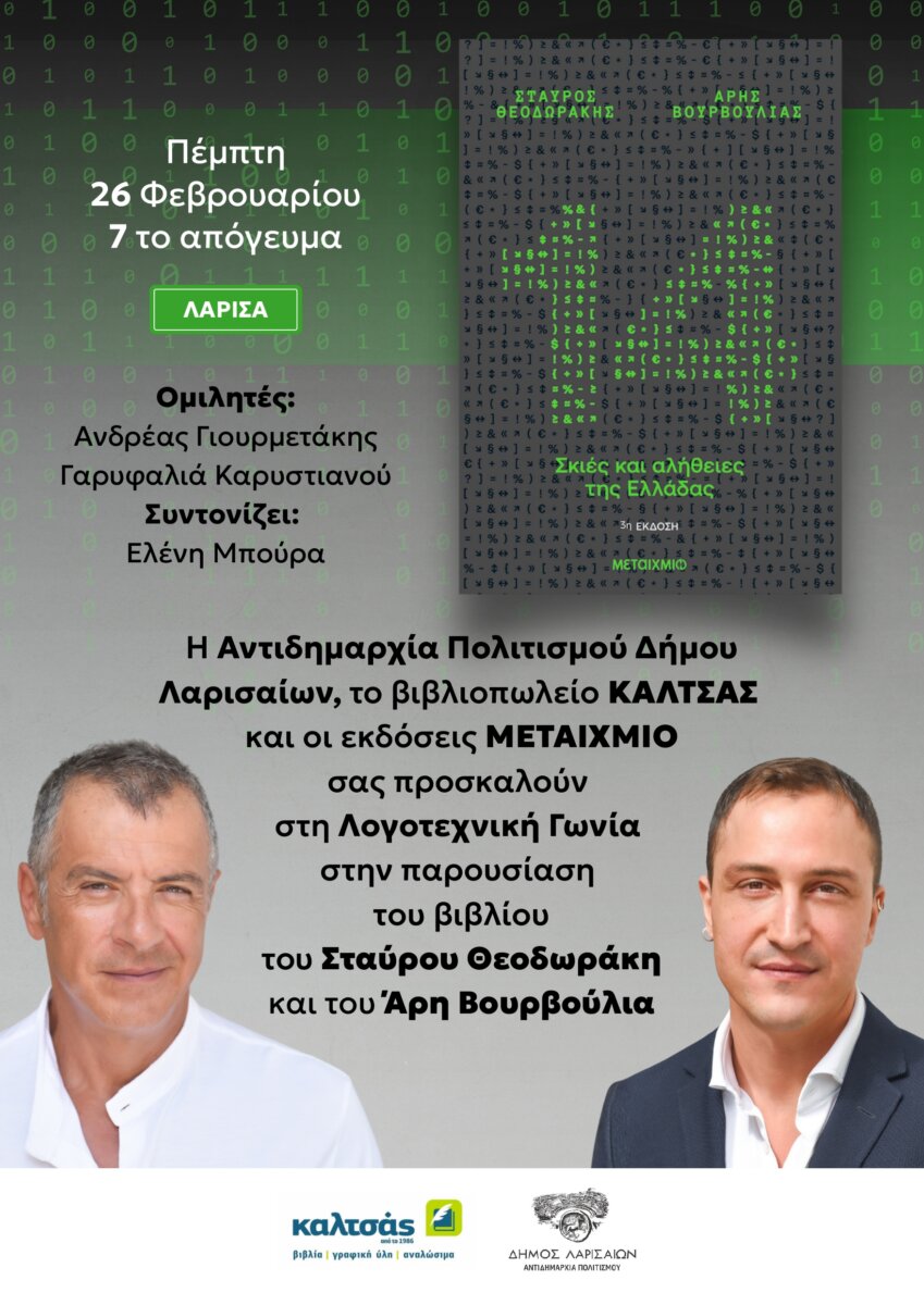 Το νέο τους βιβλίο με τίτλο “14 σκιές και αλήθειες της Ελλάδας|”, παρουσιάζουν ο δημοσιογράφος Σταύρος Θεοδωράκης και ο Άρης Βουρβούλιας, την Πέμπτη 26 Φεβρουαρίου 2026, στις 19:00 στη Λογοτεχνική Γωνία (Γαληνού & Φαρμακίδου), στη Λάρισα, σε συνεργασία με την Αντιδημαρχία Πολιτισμού του Δήμου Λαρισαίων και το βιβλιοπωλείο ΚΑΛΤΣΑΣ .