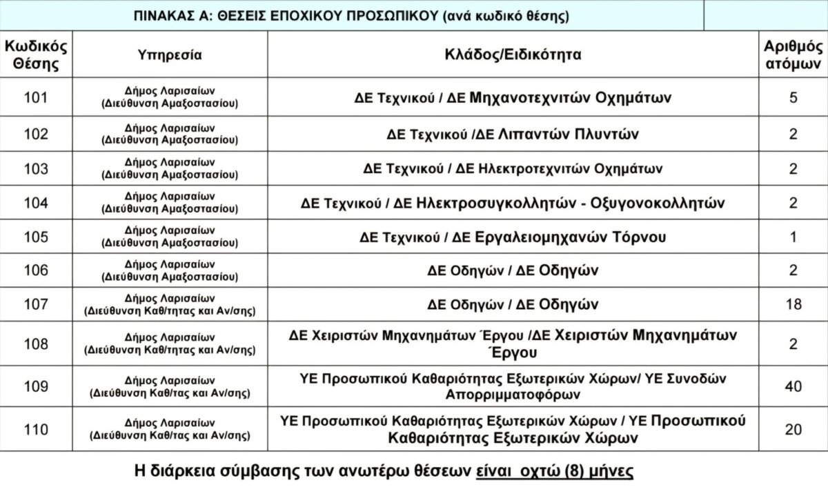 Ο Δήμος Λαρισαίων προχωρά στην πρόσληψη συνολικά 94 ατόμων για την κάλυψη αναγκών ανταποδοτικού χαρακτήρα, με σύμβαση εργασίας ιδιωτικού δικαίου ορισμένου χρόνου, σύμφωνα με την Ανακοίνωση ΣΟΧ 1/2026.