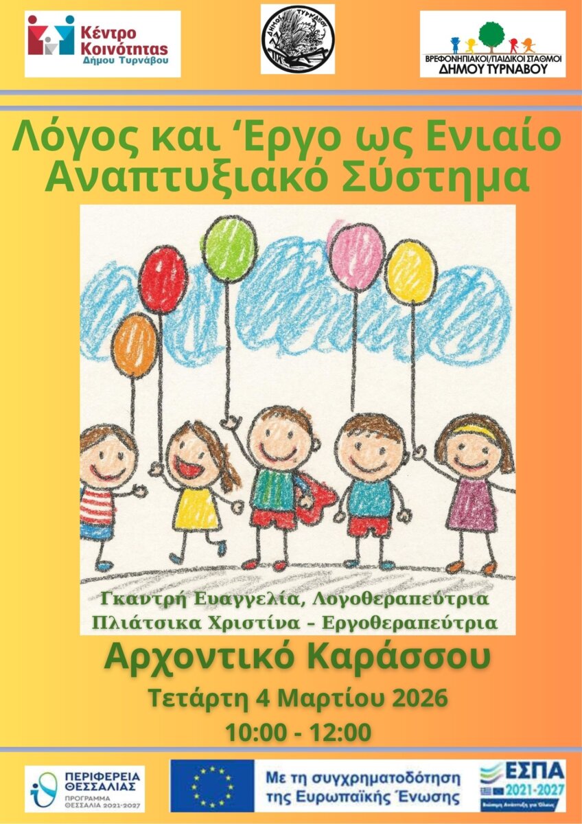 Το Κέντρο Κοινότητας Δήμου Τυρνάβου σε συνεργασία με τους Βρεφονηπιακούς και Παιδικούς Σταθμούς του Δήμου Τυρνάβου, πρόκειται να πραγματοποιήσει ενημερωτική ομιλία με θέμα: «Λόγος και έργο ως ενιαίο αναπτυξιακό σύστημα».