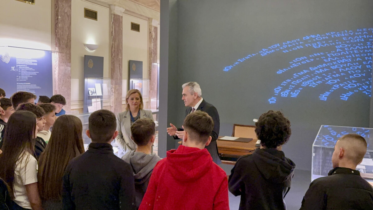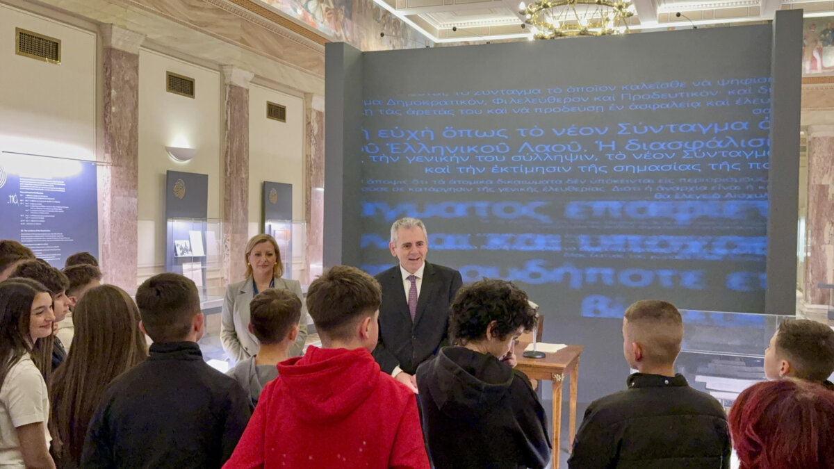 Ο βασικός, όμως, πυρήνας, το πνεύμα του Συντάγματός μας παραμένει πάντοτε ίδιο. Μάλιστα, για την παιδεία το Σύνταγμά μας ξεκαθαρίζει ότι έχει ως αποστολή την ενίσχυση της εθνικής και θρησκευτικής συνείδησης των Ελλήνων. Κι αυτό πρέπει να το έχετε πάντοτε υπόψη σας, ό,τι κι αν επιλέξετε στη ζωή σας. Ανήκετε σε ένα έθνος με μεγάλη ιστορία και σπουδαία πνευματική κληρονομιά, και το ελληνικό κράτος έχει αποστολή να τη διατηρήσει και να τη μεταδώσει, προσαρμοζόμενο βέβαια ταυτόχρονα στις ανάγκες της κάθε εποχής. Με αυτές τις σκέψεις και πάλι σας καλωσορίζω στη Βουλή και ελπίζω να είναι ιδιαίτερα ενδιαφέρουσα η εμπειρία της επίσκεψής σας εδώ, στον αποκαλούμενο και ναό της δημοκρατίας».
