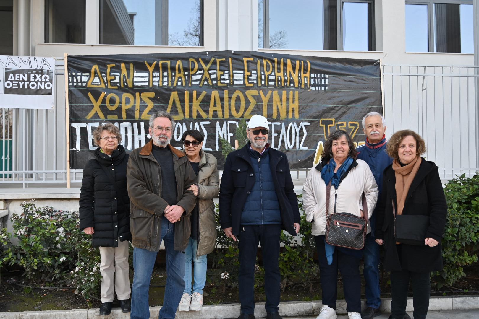 Στα δικαστήρια δίνουν για μία ακόμη φορά το παρών συγγενείς θυμάτων, ενώ στο πλευρό τους βρέθηκαν μέλη της εθελοντικής πρωτοβουλίας Τ57 από τη Λαμία, που ανάρτησαν πανό συμπαράστασης στην είσοδο του Δικαστικού Μεγάρου Λάρισας.