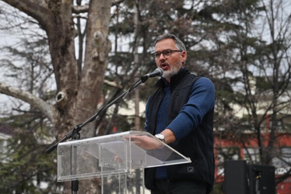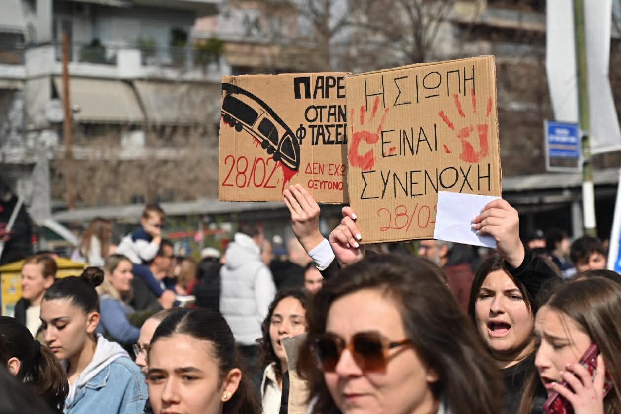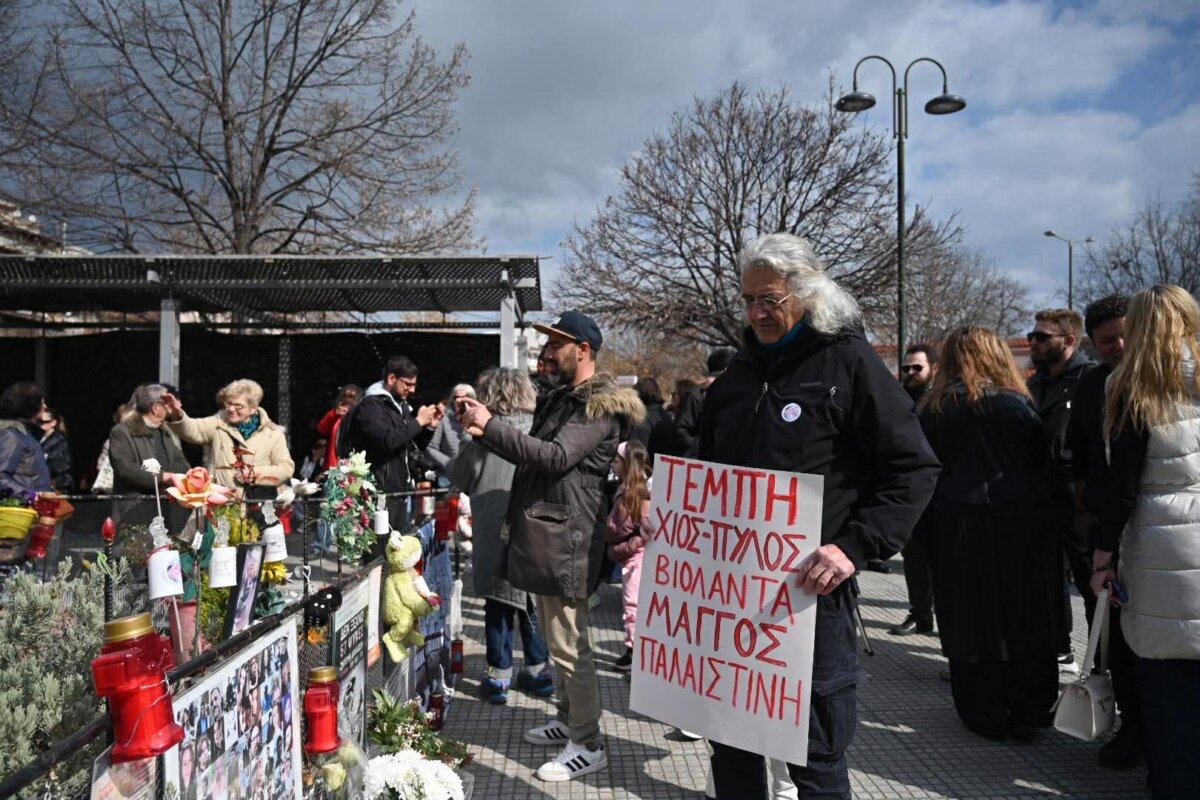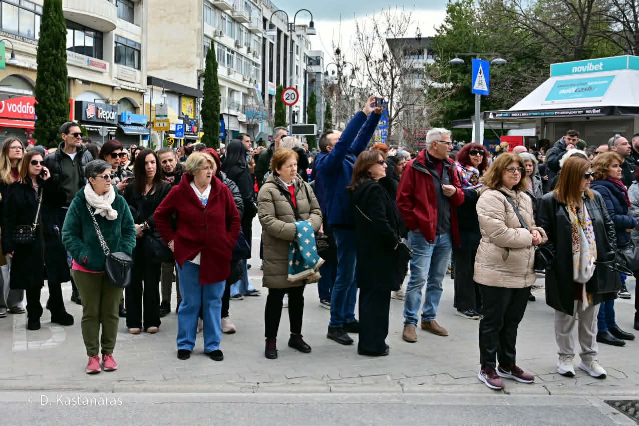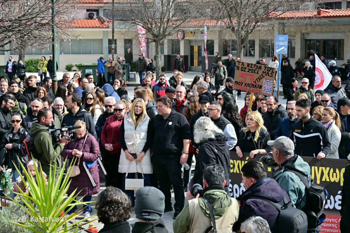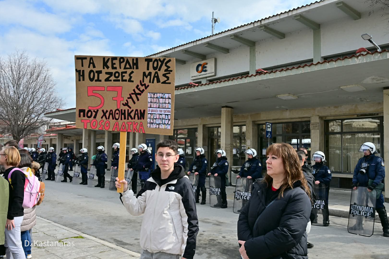 Εκατοντάδες πολίτες, κρατώντας πανό και φωνάζοντας συνθήματα για δικαιοσύνη και απόδοση ευθυνών κατέκλυσαν το κέντρο της πόλης ενώ λίγο πριν της 2:00 μ.μ. η πορεία κατέληξε στον σιδηροδρομικό σταθμό.
