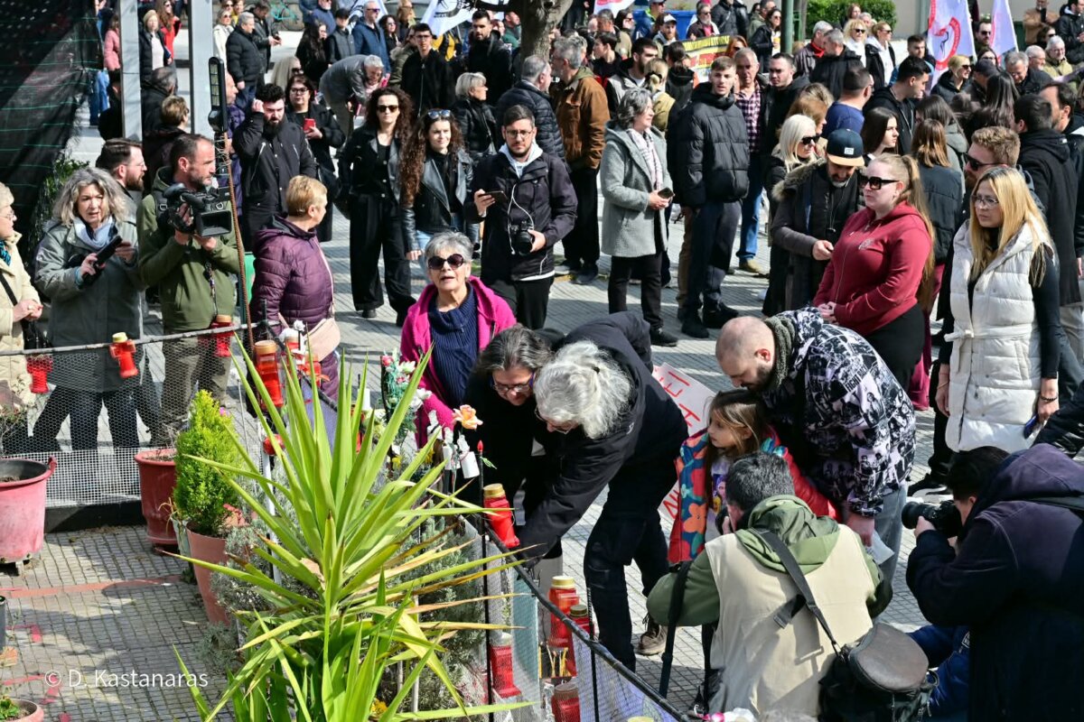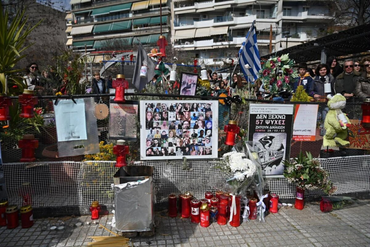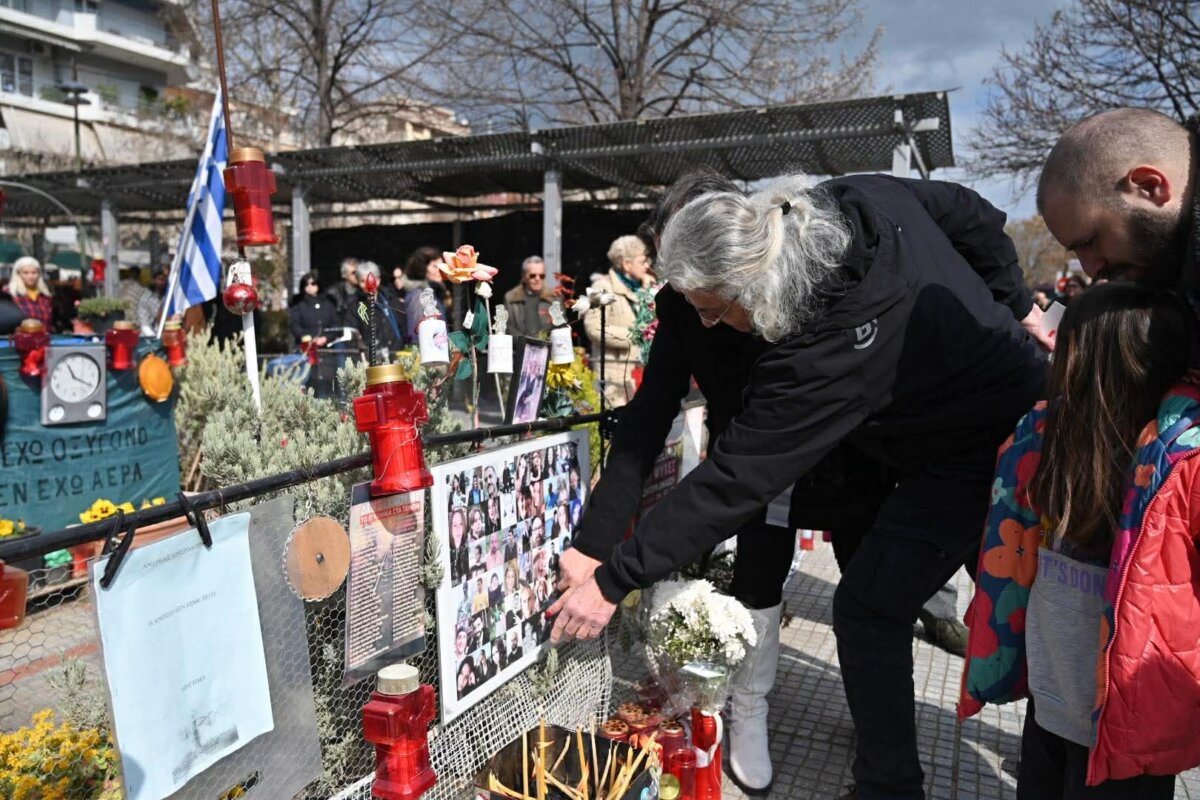 Μπροστά από το μνημείο των Τεμπών διαβάστηκαν τα 57 ονόματα ενώ κρατήθηκε κι ενός λεπτού σιγή για τους νεκρούς της τραγωδίας.