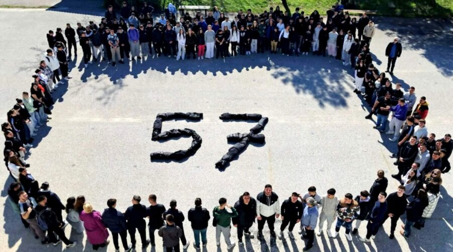 Αργότερα, με τη συμμετοχή όλου του σχολείου σχηματίστηκε ο αριθμός 57, με μαύρα μπουφάν παιδιών, δηλώνοντας με βροντερή φωνή “Ποτέ ξανά !”. Όλοι οι μαθητές ανταποκρίθηκαν στο κάλεσμα του 15μελούς θετικά και με ενθουσιασμό, για αυτό και αξίζουν θερμά συγχαρητήρια, που κατάφεραν να εκφράσουν τα συναισθήματά τους για τη διατήρηση της μνήμης και της ανάγκη απόδοσης δικαιοσύνης.