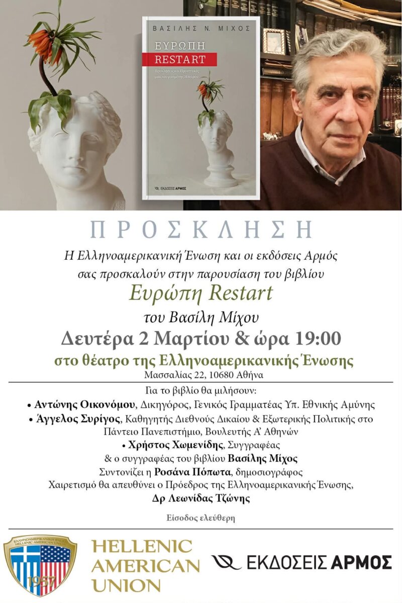 Παρουσιάζεται σήμερα το βιβλίο Ευρώπη Restart του συγγραφέα Βασίλη Μίχου στο θέατρο της Ελληνοαμερικανικής Ένωσης στην Αθήνα.