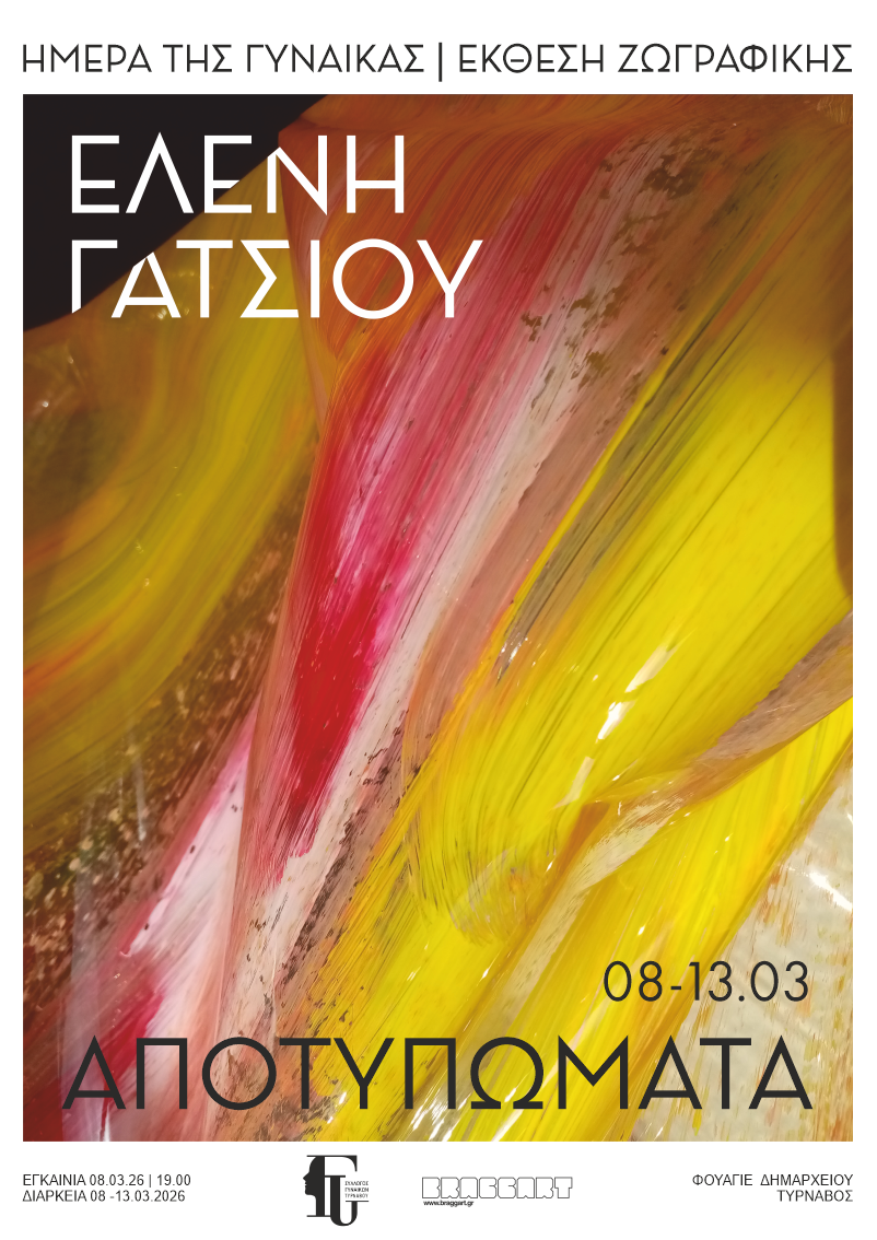 Ο Σύλλογος Γυναικών Τυρνάβου σε συνεργασία με την γκαλερί BRAGGART εγκαινιάζει την αναδρομική έκθεση της εικαστικού Ελένης Γάτσιου (1997-2024) με τίτλο «Αποτυπώματα», την Κυριακή 08 Μαρτίου Ημέρα της γυναίκας, στις 19:00-22:00, στο Φουαγιέ του Δημαρχείο Τυρνάβου.