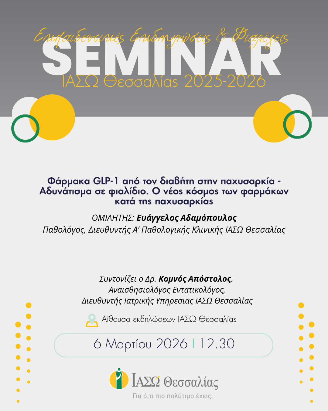 Η διάλεξη πραγματοποιείται υβριδικά: Στην Αίθουσα Εκδηλώσεων του ΙΑΣΩ Θεσσαλίας ή online μέσω Microsoft Teams
