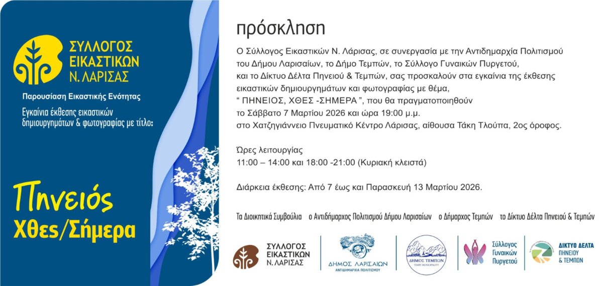 Μια μεγάλη εικαστική και φωτογραφική έκθεση αφιερωμένη στον Πηνειό ποταμό, που έπαιξε καθοριστικό ρόλο στην ιστορία και την καθημερινότητα της Θεσσαλίας, ανοίγει τις πόρτες της στο Χατζηγιάννειο Πνευματικό Κέντρο Λάρισας, με τίτλο: «ΠΗΝΕΙΟΣ, ΧΘΕΣ – ΣΗΜΕΡΑ».