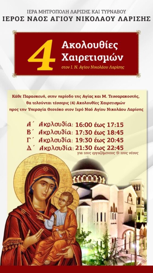 Κάθε Παρασκευή, στην περίοδο της Αγίας και Μ. Τεσσαρακοστής, θα τελούνται τέσσερις (4) Ακολουθίες Χαιρετισμών προς την Υπεραγία Θεοτόκο στον Ιερό Ναό Αγίου Νικολάου Λαρίσης, σύμφωνα με το κάτωθι πρόγραμμα: