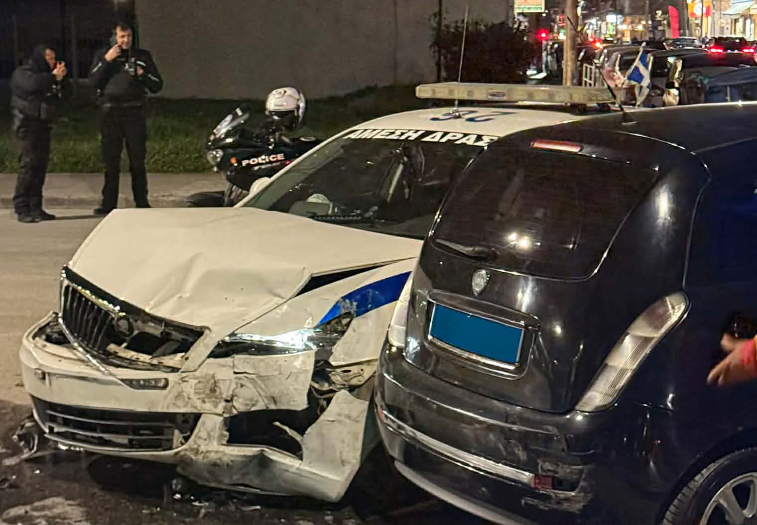 Από τη σύγκρουση τραυματίστηκε στο πόδι ένας αστυνομικός, καθώς και ένας άνδρας που βρισκόταν μέσα στο περιπολικό όπως και μία γυναίκα.