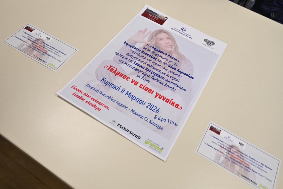 Η εκδήλωση θα πραγματοποιηθεί την Κυριακή στις 11 το πρωί, στην Πινακοθήκη Λάρισας, με θέμα «Τόλμησε να είσαι γυναίκα». Κεντρική ομιλήτρια θα είναι η Έρρικα Πρεζεράκου, μια προσωπικότητα που, όπως τονίστηκε, ξεχωρίζει για τη δυναμική της παρουσία και τη διαδρομή της.