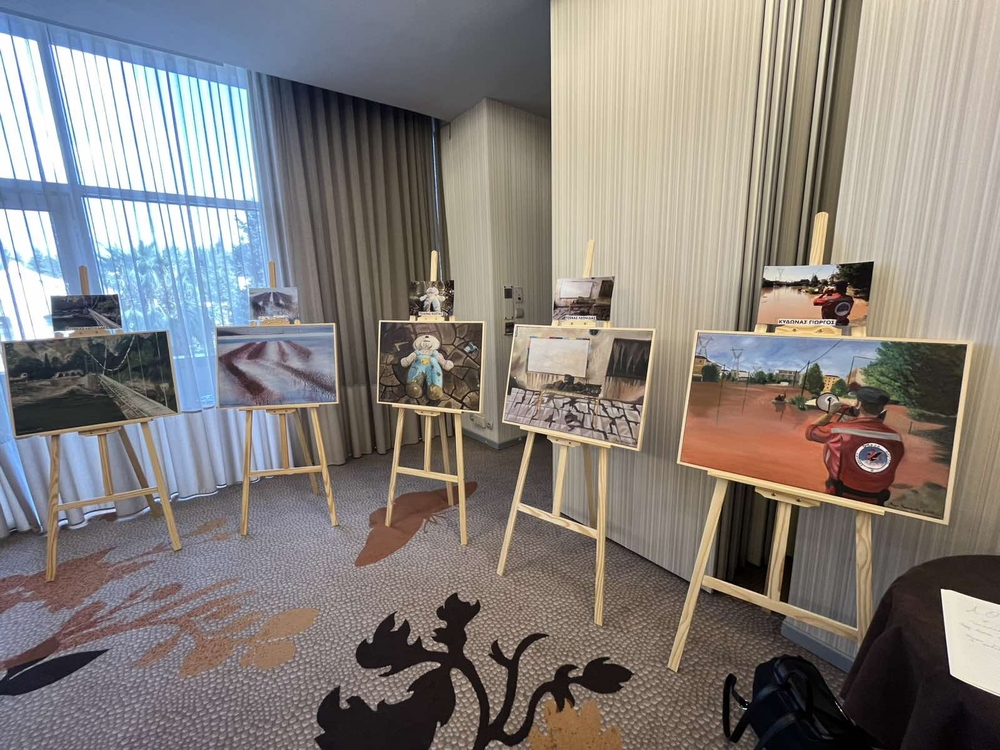 Τέλος, η εικαστικός κ. Μαρία Κωστοπούλου αναφέρθηκε στη δημιουργική διαδικασία και στα έργα που φιλοτέχνησε, εξηγώντας πώς οι φωτογραφίες των φωτορεπόρτερ αποτέλεσαν την αφετηρία για τη ζωγραφική αποτύπωση του ανθρώπινου πόνου, της δοκιμασίας αλλά και της ελπίδας που αναδύθηκε μέσα από την τραγωδία.