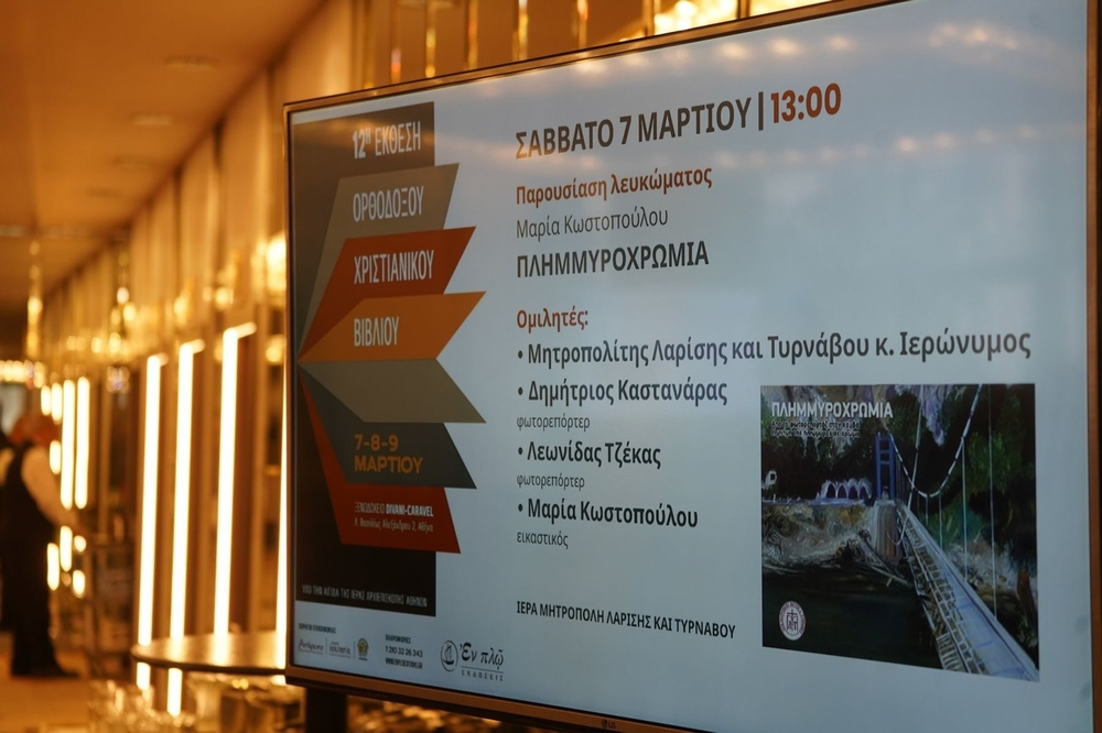 Στο πλαίσιο της 12ης Έκθεσης Χριστιανικού Βιβλίου που πραγματοποιείται αυτές τις ημέρες στο ξενοδοχείο Κάραβελ στην Αθήνα από τις Εκδόσεις «Εν πλω», η Ιερά Μητρόπολη Λαρίσης και Τυρνάβου συμμετείχε ενεργά, παρουσιάζοντας ένα ιδιαίτερο και συγκινητικό λεύκωμα, το οποίο φιλοτεχνήθηκε από την εικαστικό κ. Μαρία Κωστοπούλου.