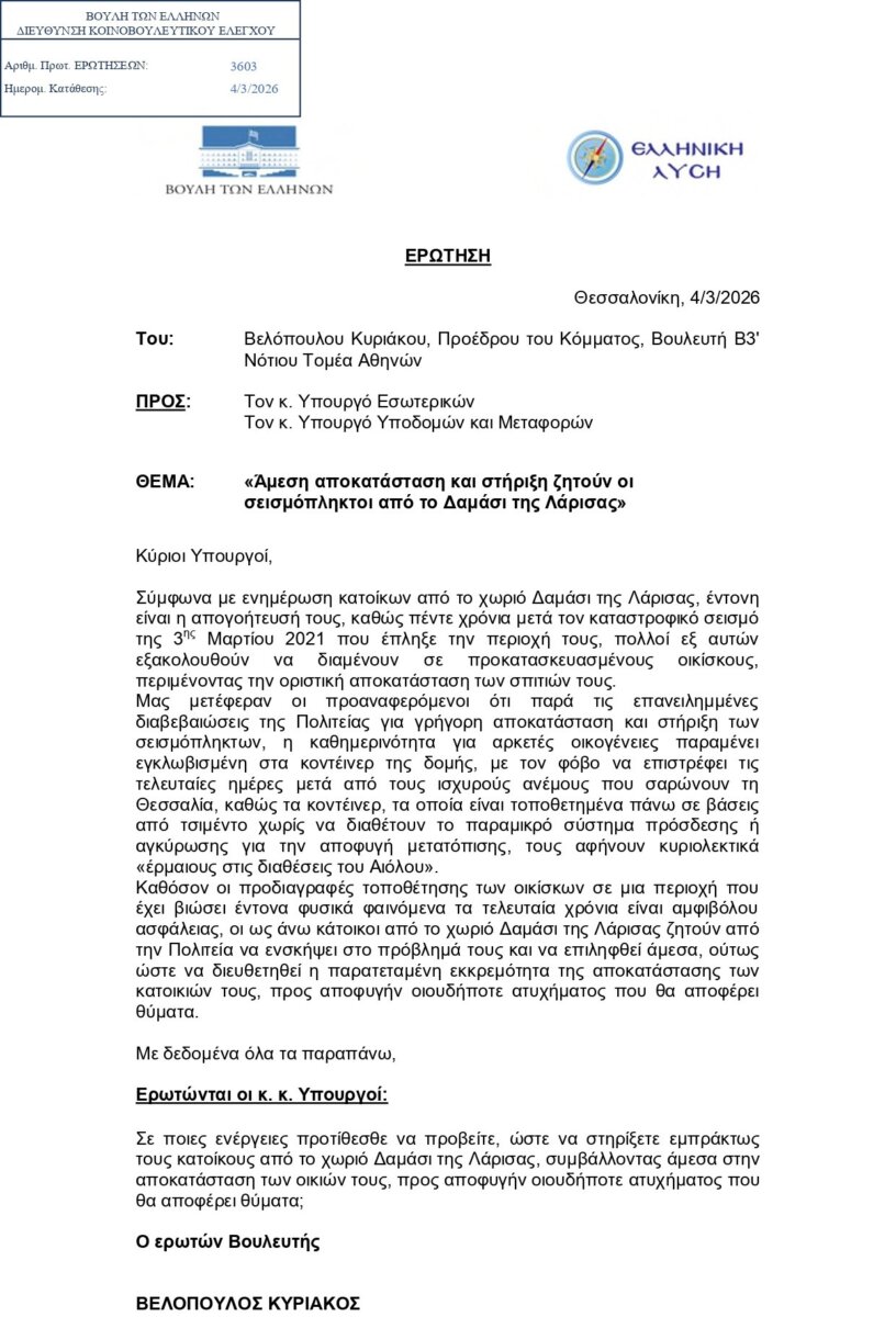 Σε ποιες ενέργειες προτίθεσθε να προβείτε, ώστε να στηρίξετε εμπράκτως τους κατοίκους από το χωριό Δαμάσι της Λάρισας, συμβάλλοντας άμεσα στην αποκατάσταση των οικιών τους, προς αποφυγήν οιουδήποτε ατυχήματος που θα αποφέρει θύματα;