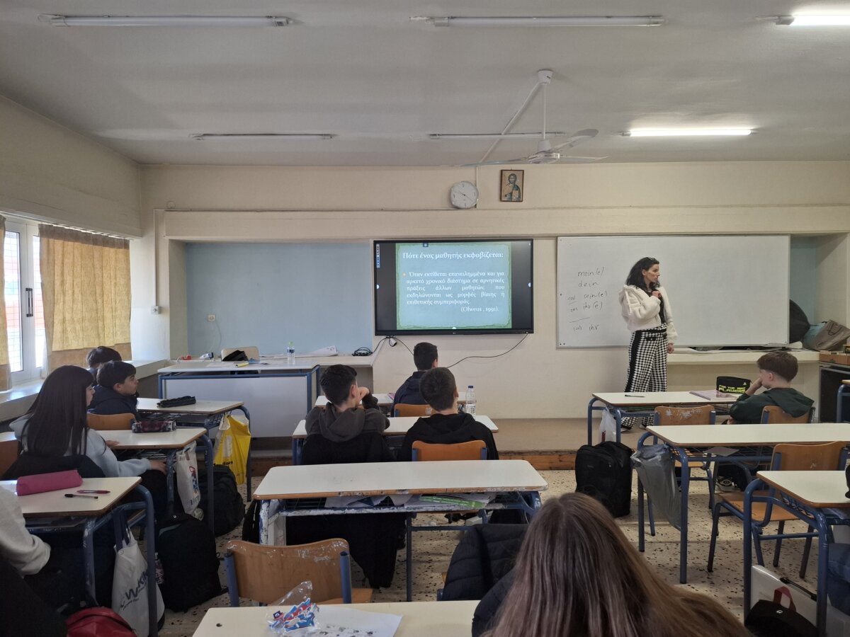Στο πλαίσιο αυτό υλοποιήθηκε την Τρίτη 3 Μαρτίου 2026, η δράση με τίτλο «Κατανόηση της έννοιας του εκφοβισμού και του πλαισίου του», με υπεύθυνες την Ψυχολόγο κ. Πιτένη Χρυσούλα και τη Διευθύντρια του σχολείου κ. Στεργιανή Λιάπη. Οι μαθητές ενημερώθηκαν για το φαινόμενο του σχολικού εκφοβισμού, τη διάκριση ανάμεσα στο πείραγμα και την εκφοβιστική συμπεριφορά, καθώς και για τους ρόλους που εμφανίζονται σε περιστατικά εκφοβισμού (θύτης, θύμα, παρατηρητής). Παράλληλα, αναδείχθηκε η σημασία της υπέρβασης της σιωπής και παρουσιάστηκε ο ρόλος της Ομάδας Διαμεσολάβησης ως μηχανισμού υποστήριξης μέσα στη σχολική κοινότητα.