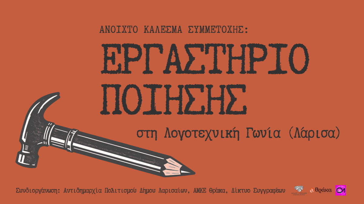 Η Αντιδημαρχία Πολιτισμού του Δήμου Λαρισαίων, η ΑΜΚΕ Θράκα και το Δίκτυο Συγγραφέων ανακοινώνουν την παράταση της προθεσμίας υποβολής αιτήσεων για τη συμμετοχή στο POETRY WORKSHOP / Εργαστήριο Ποίησης, λόγω του αυξημένου ενδιαφέροντος.