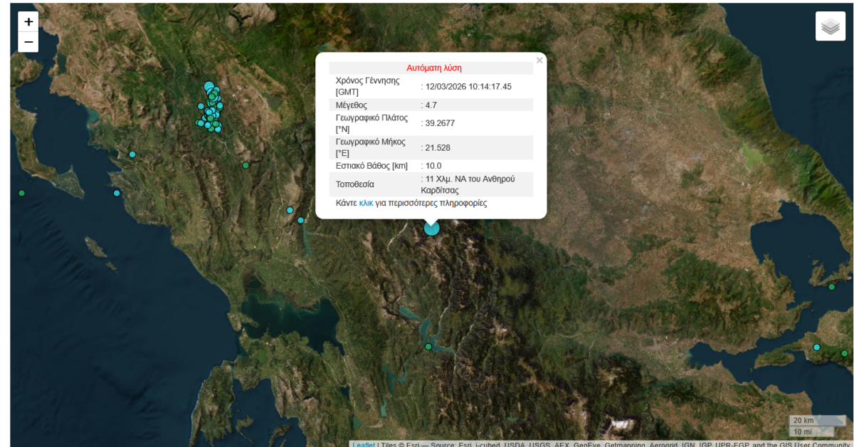 Σεισμική δόνηση μεγέθους 4,8 βαθμών της κλίμακας Ρίχτερ, σύμφωνα με το Γεωδυναμικό Ινστιτούτο, καταγράφηκε στην περιοχή του Ανηθορού Καρδίτσας.