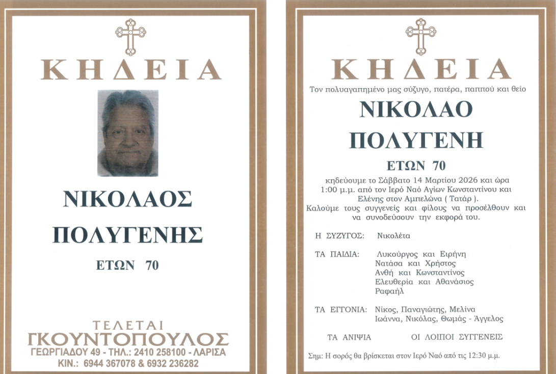 Έφυγε από τη ζωή σε ηλικία ο Νικόλαος Πολυγένης σε ηλικία 70 ετών.