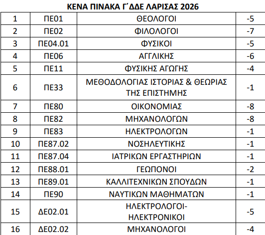 Στο πλαίσια της ενημέρωσης από τη ΔΑΚΕ Καθηγητών Ν. Λάρισας, για θέματα ΠΥΣΔΕ, δημοσιοποιείται ο πίνακας των οργανικών κενών-πλεονασμάτων Καθηγητών Δ. Ε. του Ν. Λάρισας.