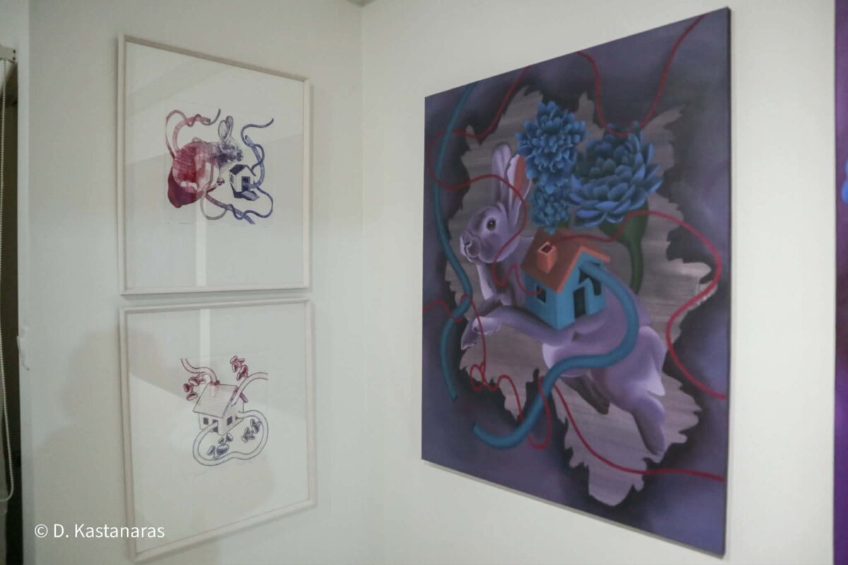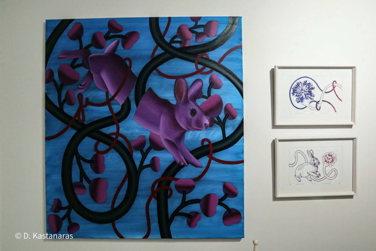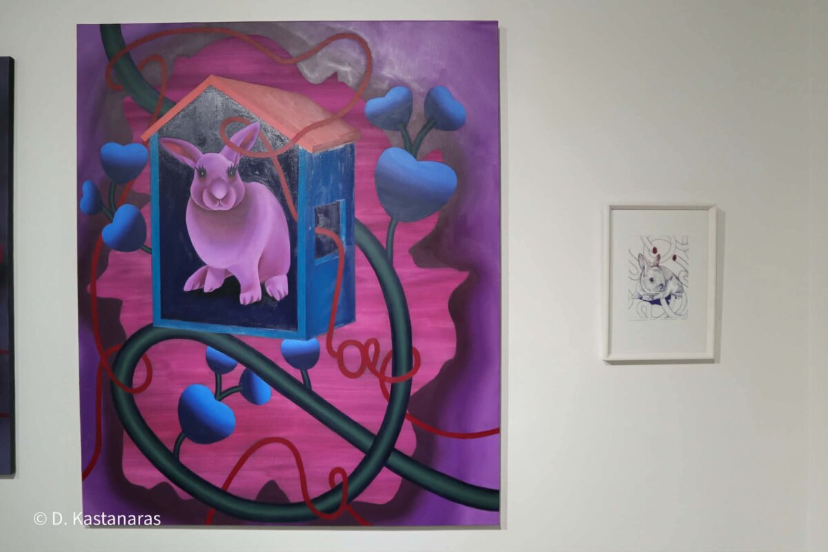 Η δημιουργική διαδικασία χαρακτηρίζεται από μια εμμονική επανάληψη σταθερών στοιχείων. Αυτός ο ρυθμός δεν είναι τυχαίος· αποτελεί μια συνειδητή προσπάθεια επιβολής ελέγχου και τάξης απέναντι στο χάος των ανεξέλεγκτων ανατροπών της ζωής. Στο επίκεντρο αυτού του κόσμου βρίσκεται το κουνέλι, μια μορφή που ενσαρκώνει το μητρικό πρότυπο και την αναπαραγωγή. Με μάτια που παραπέμπουν στην αθωότητα των παιδικών παιχνιδιών, το ζώο γίνεται ο συνδετικός κρίκος με την παιδική ηλικία, εκεί όπου η ασφάλεια και ο φόβος συνυπάρχουν.
