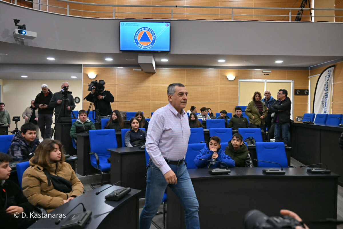 Ο Περιφερειάρχης Θεσσαλίας, Δημήτρης Κουρέτας, καλωσορίζοντας τους μαθητές, τόνισε τη σημασία της ενημέρωσης των νέων σε θέματα πολιτικής προστασίας.