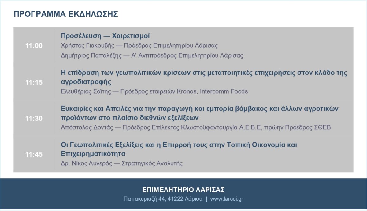 Η εκδήλωση θα πραγματοποιηθεί το Σάββατο 21 Μαρτίου 2026 στις 11:00, στην αίθουσα Διοικητικού Συμβουλίου του Επιμελητηρίου Λάρισας, Παπακυριαζή 44, Λάρισα (2ος όροφος).