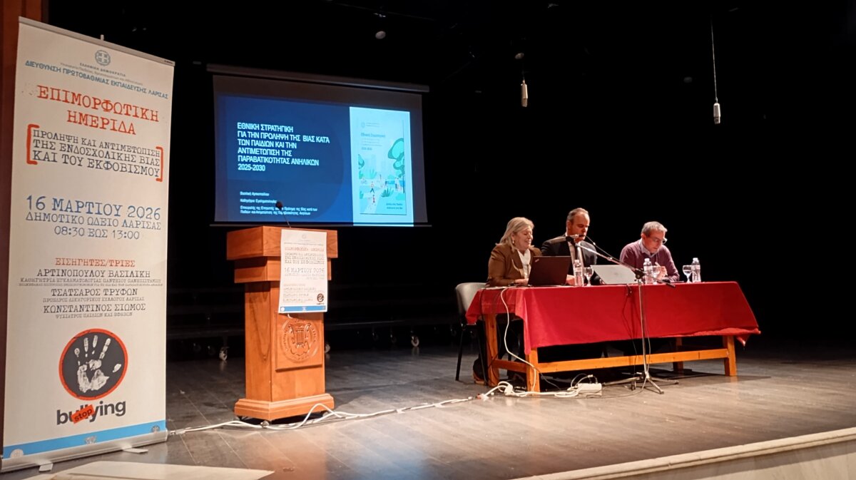 H Διεύθυνση Πρωτοβάθμιας Εκπαίδευσης Λάρισας και η Ομάδα Δράσης της για την Πρόληψη και Αντιμετώπιση της Ενδοσχολικής Βίας και Εκφοβισμού (Ε.ΒΙ.Ε.), σε συνεργασία με υην Ιερά Μητρόπολη Λαρίσης και Τυρνάβου και τον Δήμο Λαρισαίων, διοργάνωσε με ιδιαίτερη επιτυχία τη Δευτέρα 16/3/2026, στο Δημοτικό Ωδείο Λάρισας, την επιμορφωτική Ημερίδα, με θέμα: “Πρόληψη και Αντιμετώπιση της Ενδοσχολικής Βίας και του Εκφοβισμού”, στην οποία συμμετείχαν εκατοντάδες μέλη της σχολικής κοινότητας και συγκεκριμένα Δ/ντές-ντριες εκπαιδευτικοί, Ψυχολόγοι ΠΕ23, Κοινωνικοί Λειτουργοί ΠΕ30, αλλά και γονείς/κηδεμόνες μαθητών και μαθητριών Δημοτικών Σχολείων και Νηπιαγωγείων. Η Ημερίδα είχε ως στόχο την εξειδικευμένη κατάρτιση των εκπαιδευτικών και των μελών της σχολικής κοινότητας στο κρίσιμο ζήτημα της πρόληψης και αντιμετώπισης της ενδοσχολικής βίας και του Εκφοβισμού, μέσα από εισηγήσεις ειδικών επιστημόνων.