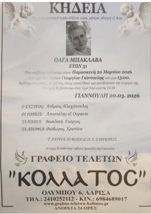 Έφυγε από τη ζωή σε ηλικία 51 ετών η Όλγα Μπακλαβά.