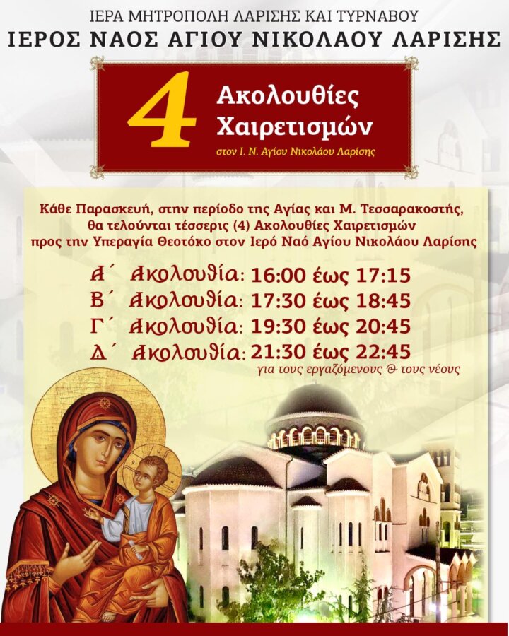 Κάθε Παρασκευή, στην περίοδο της Αγίας και Μ. Τεσσαρακοστής, θα τελούνται τέσσερις (4) Ακολουθίες Χαιρετισμών προς την Υπεραγία Θεοτόκο στον Ιερό Ναό Αγίου Νικολάου Λαρίσης, σύμφωνα με το κάτωθι πρόγραμμα: