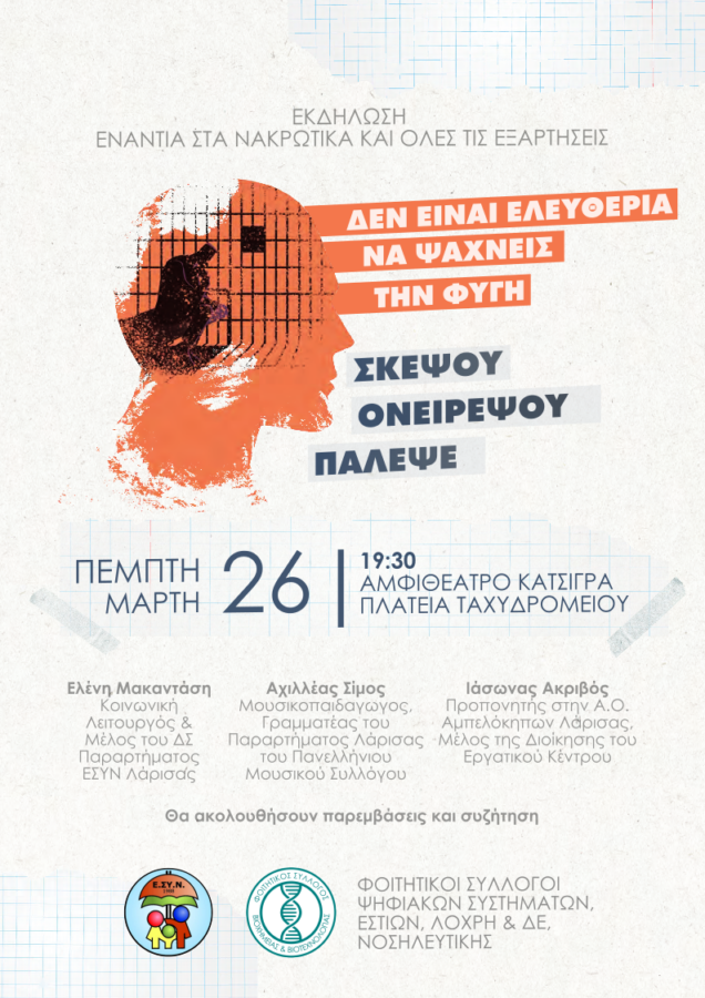 Σε αυτή την κατεύθυνση, οι Φοιτητικοί Σύλλογοι Λάρισας (Βιοχημείας & Βιοτεχνολογίας, Ψηφιακών Συστημάτων, Εστιών, ΛΟΧΡΗ & ΔΕ, Νοσηλευτικής) διοργανώνουν εκδήλωση με τίτλο «Δεν είναι ελευθερία να ψάχνεις την φυγή – Σκέψου, Ονειρέψου, Πάλεψε», απέναντι στα ναρκωτικά και κάθε μορφής εξάρτησης.