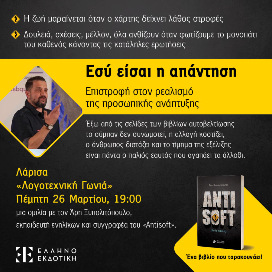 Ο συγγραφέας του best seller “Antisoft” Άρης Ξυπολιτόπουλος ιχνηλατεί τη διαδρομή προς την προσωπική εξέλιξη και την ευτυχία, την Πέμπτη 26 Μαρτίου στις 19.00 στον Χώρο Πολιτισμού «Λογοτεχνική γωνιά» ((Γαληνού & Φαρμακίδου, Λάρισα)
