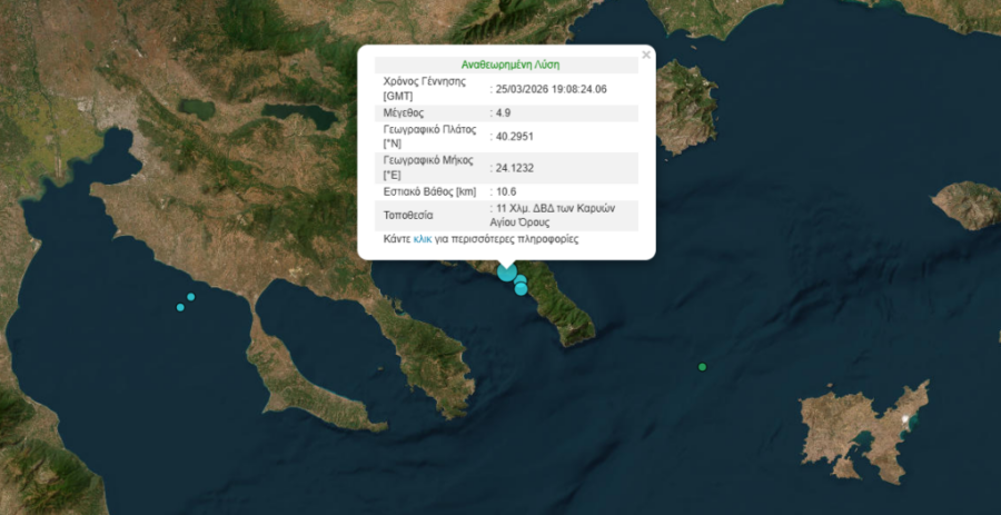 Ισχυρή σεισμική δόνηση 4,9 βαθμών της κλίμακας Ρίχτερ σημειώθηκε το βράδυ της Τετάρτης 25 Μαρτίου, 8 χιλιόμετρα ΒΔ των Καρυών Αγίου Όρους.