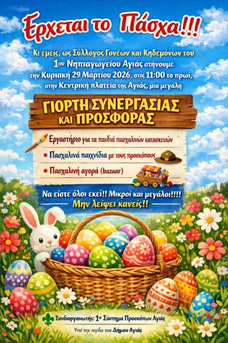 Αυτήν την Κυριακή 29 Μαρτίου και ώρα 11:00 π.μ. το 1ο Σύστημα Προσκόπων Αγιάς συμμετέχει μαζί με τον Σύλλογο γονέων και κηδεμόνων του 1ου Νηπιαγωγείου Αγιάς σε μια μεγάλη γιορτή για όλα τα παιδιά με πολλά παιχνίδια και κατασκευές.