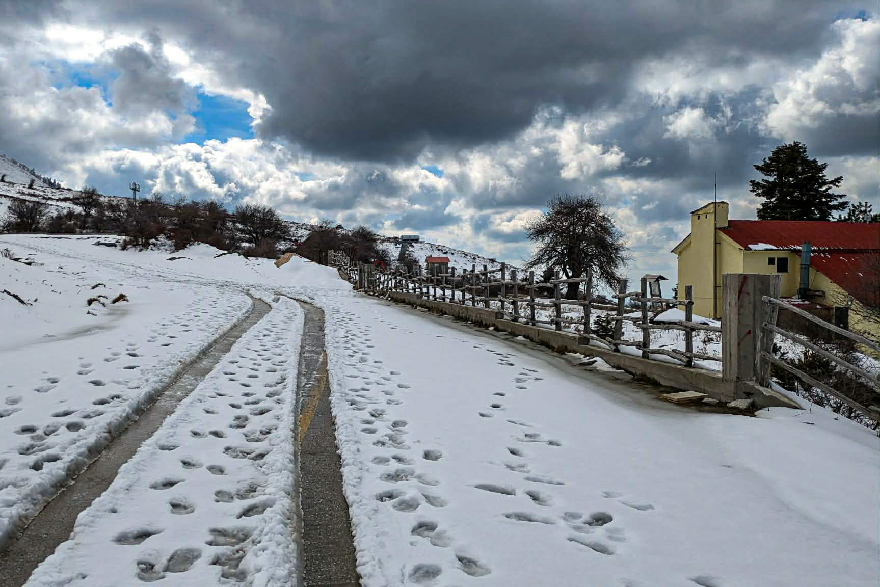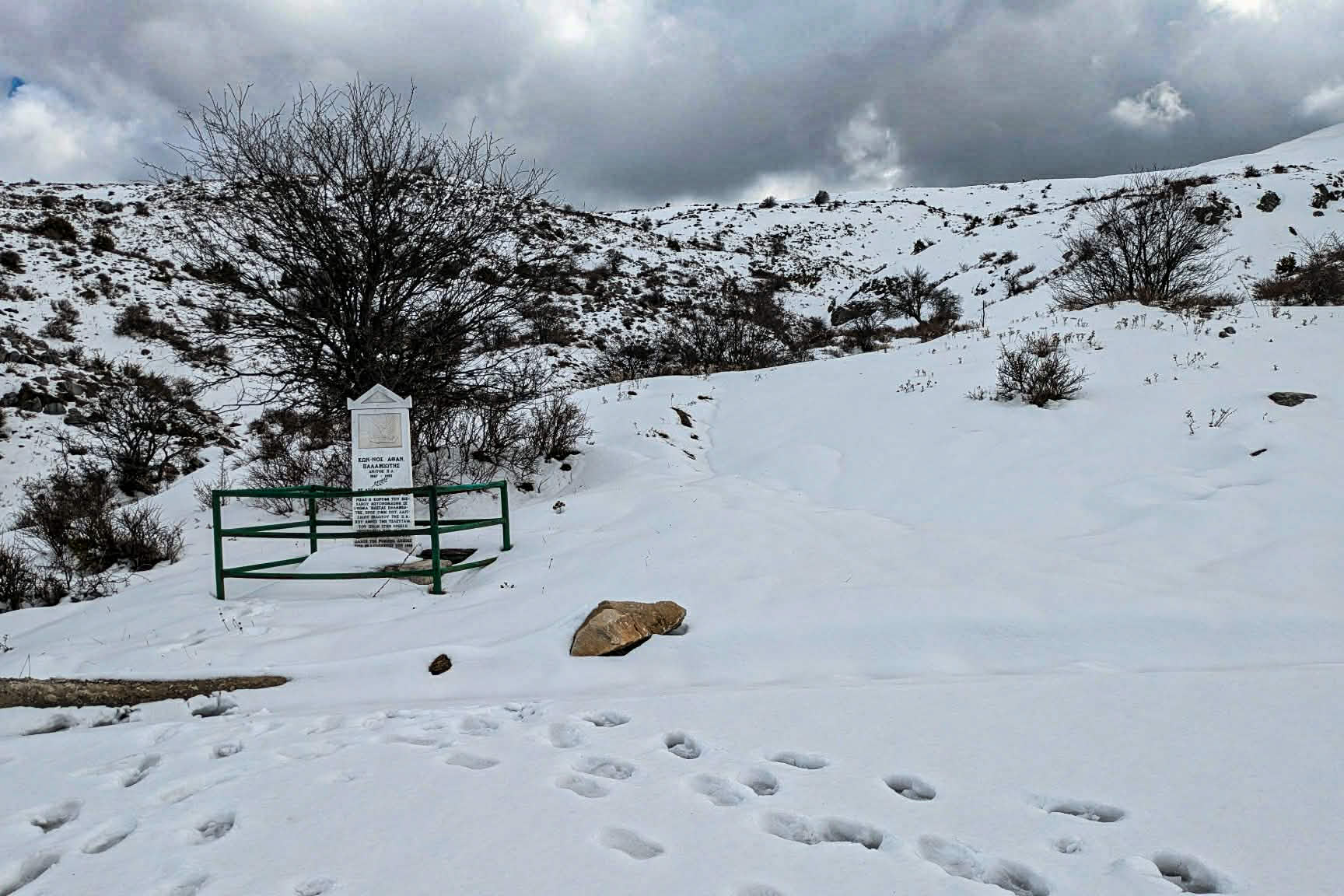 Το χιόνι αρχίζει από την άκρη του μονοπατιού και όσο προχωρώ γίνεται πιο πυκνό, πιο καθαρό. Κάθε βήμα αφήνει το αποτύπωμά του πάνω σε μια επιφάνεια που μοιάζει άθικτη, σαν να περιμένει τον επισκέπτη που θα την «ξυπνήσει.»